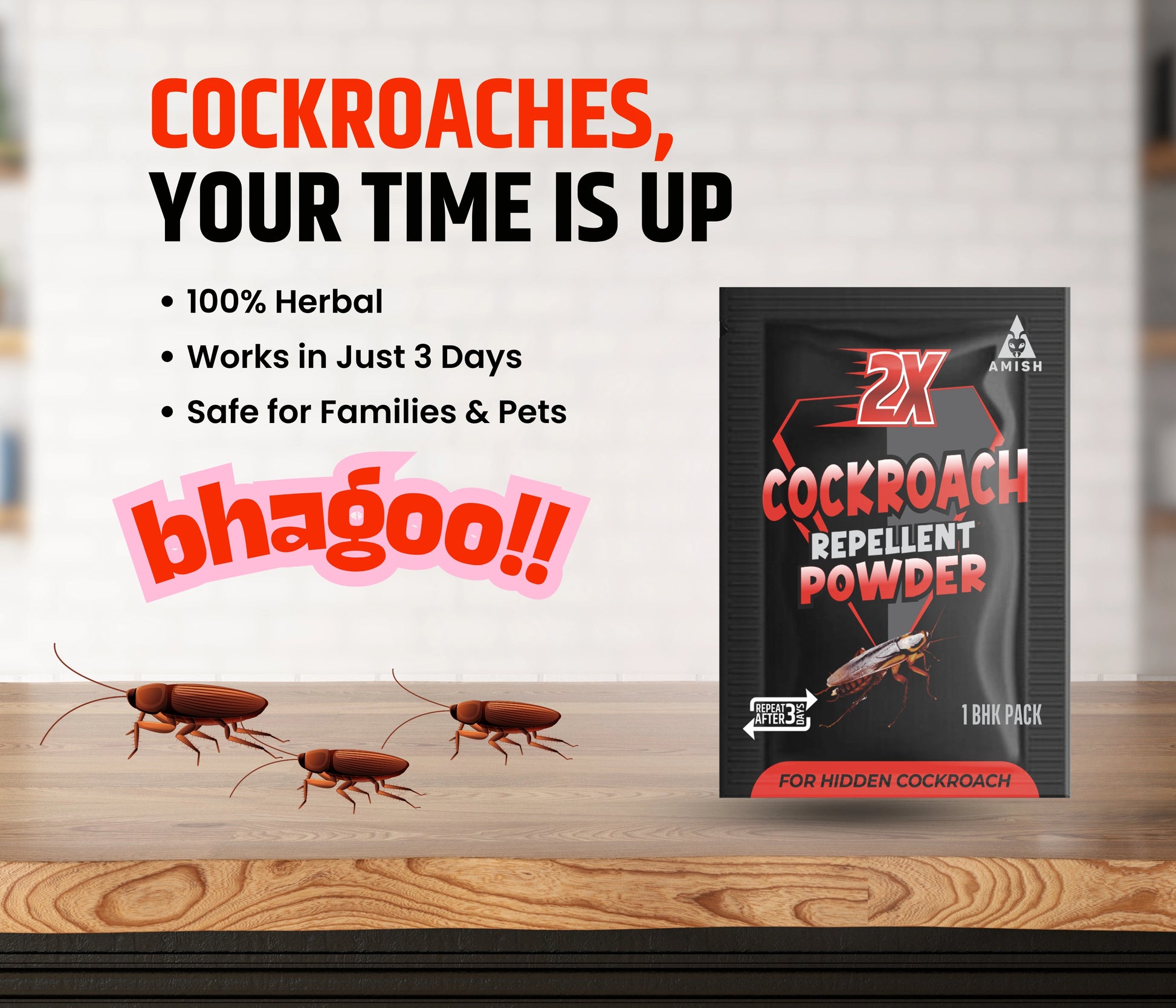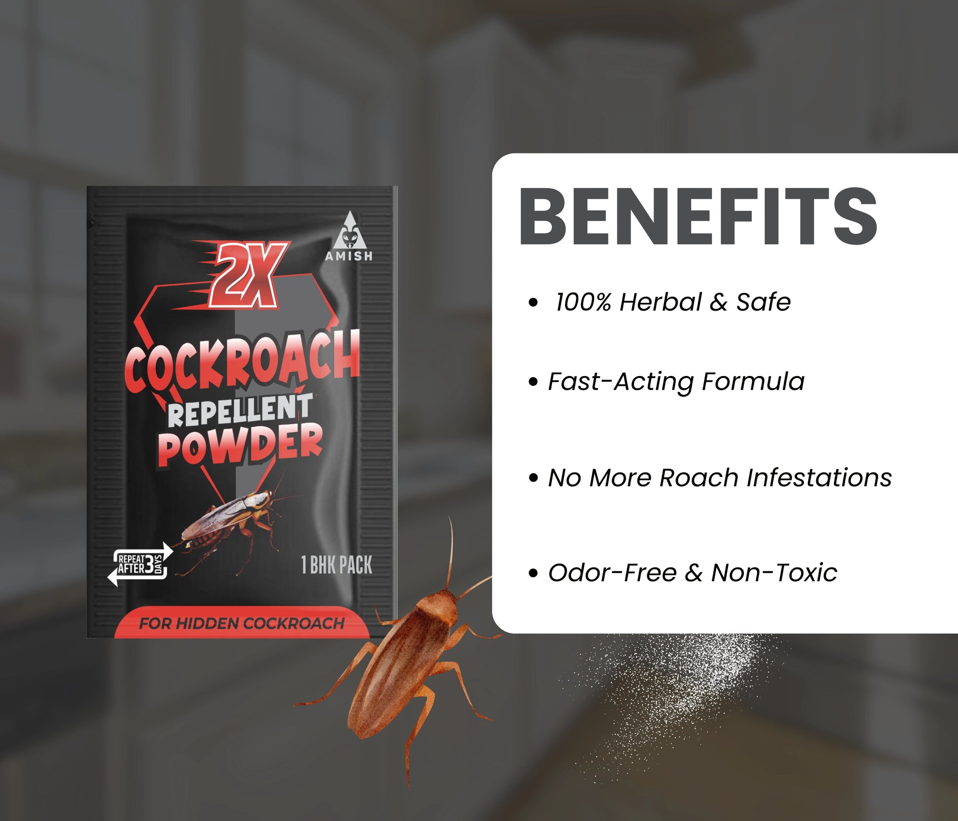 Amish Super Cockroach Powder Herbal, Strong & Organic Indoor Pest Control Solution Protect your home from health hazards caused by cockroaches with Amish Super Cockroach Powder, a powerful, herbal, and organic solution designed for effective cockroach control. These pests are carriers of bacteria and pathogens that can cause diseases like dysentery, typhoid fever, asthma, and allergic reactions. Cockroaches thrive in warm, damp areas like kitchens and bathrooms, posing a direct threat to food hygiene and human health. Ignoring their presence can lead to widespread infestations that are difficult to control. Amish Super Cockroach Powder is formulated with 100% natural herbal ingredients that target the nervous system of insects, ensuring fast and complete elimination while remaining safe for your family and pets. Unlike chemical-based products, this organic repellent powder leaves no toxic residue, making it eco-friendly and sustainable. Its multipurpose formula disrupts the life cycle of cockroaches, targeting eggs, larvae, and adults for long-lasting action. Whether dealing with German cockroaches, American cockroaches, or common species, Amish Super Cockroach Powder delivers superior results for homes, restaurants, hotels, commercial kitchens, and other indoor spaces. Its fine powder formulation reaches hard-to-access areas like cracks, crevices, and under appliances, ensuring complete cockroach removal. Say goodbye to infestations and protect your home with this herbal, fast-acting, and powerful super cockroach repellent trusted for its safety, effectiveness, and long-lasting protection.