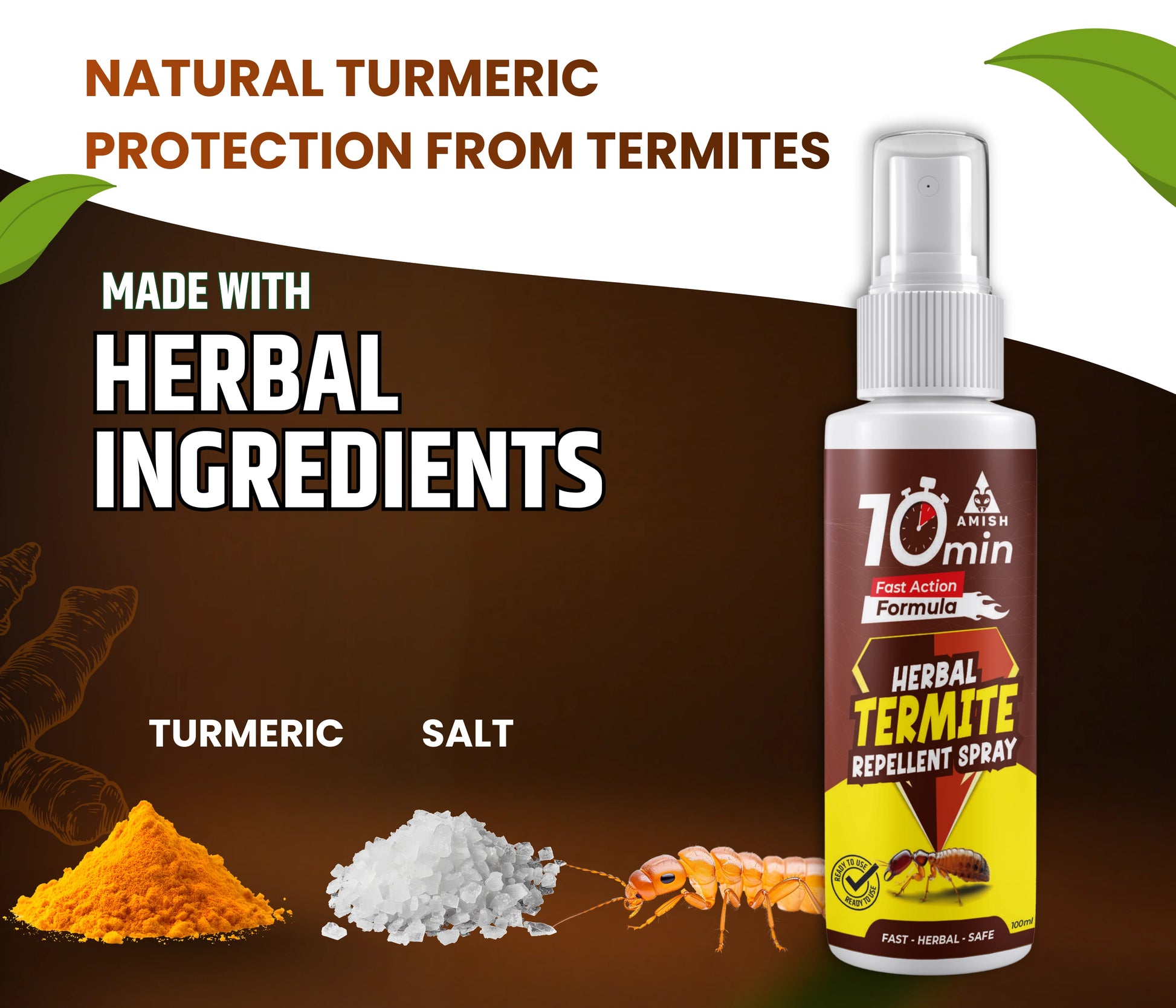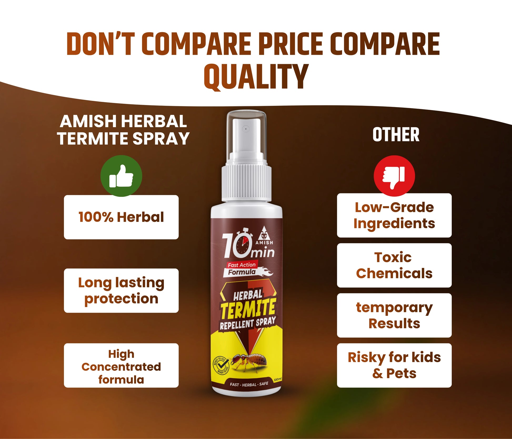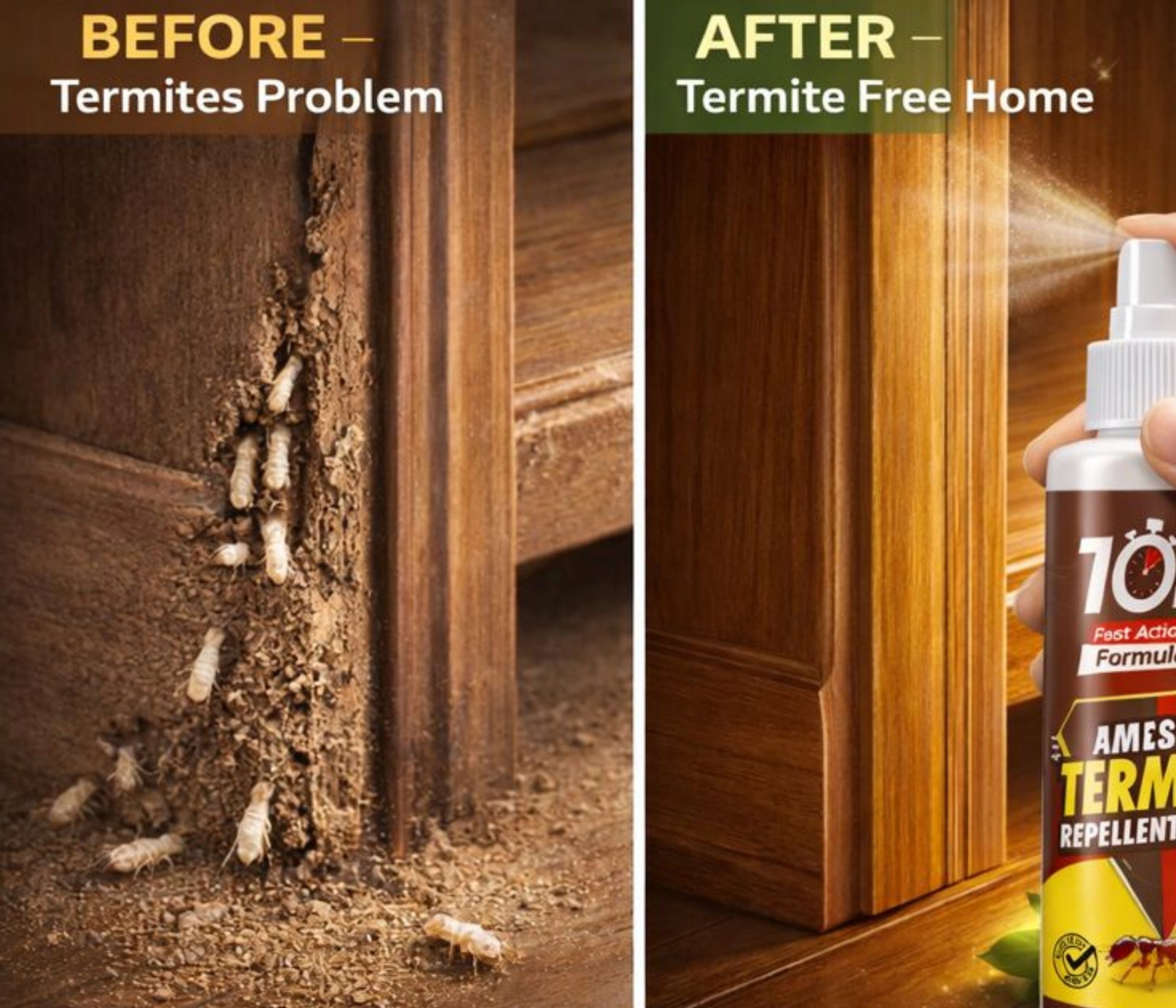 Amish Termite Spray is a powerful herbal repellent spray designed to protect your home from destructive termites (deemak) that silently attack wood, furniture, cupboards, and kitchen accessories. Termites are often found in narrow cracks, crevices, and hidden corners, spreading rapidly and multiplying in thousands within just a few days. This organic termite control solution creates an unfavorable condition for termites to survive, acting as a wooden furniture protector and long-lasting indoor termite terminator. Formulated with natural plant-based extracts, the spray is safe for humans, eco-friendly, and completely odorless, making it a comfortable choice for home spray bottles use in bedrooms, kitchens, and offices. The Amish termite aerosol spray provides instant relief in just 10 minutes, ensuring strong protection for your household wooden items, furniture, cupboards, and walls. Protect your home, kitchen, and office wooden furniture from termite damage with this easy-to-use anti-termite spray the ultimate wooden protector and insect terminator.