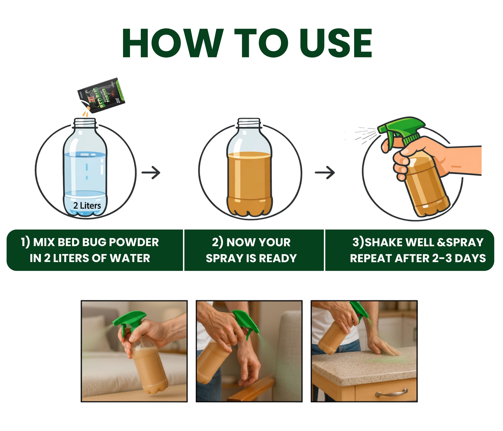 Take control of stubborn bed bug infestations with this Powerful Bed Bug Powder Repellent Concentrate, specially designed for home bugs control, khatmal removal, and long-lasting protection. Each sachet mixes easily with water to prepare 2 liters of strong bed bug spray, giving you a total of 8 liters of super-effective treatment for multi-room or full-home coverage. Formulated with a fast-action khatmal killer technology, this solution attacks adult bed bugs, nymphs, and eggs, delivering an instant knockdown effect. Its deep penetration reaches mattress seams, cracks, corners, and hidden areas where bedbugs hide and multiply, ensuring complete elimination. This herbal-inspired organic pest control solution leaves a protective layer that keeps working for weeks, preventing new infestations and keeping your home safe. It is non-staining, fabric-safe, and suitable for indoor use, making it perfect for mattresses, bedding, sofa fabrics, carpets, and wooden furniture without leaving any strong odor or residue. The Pack of 4 offers outstanding value, providing long-term availability for large homes, hostels, hotels, lodges, and rental properties. Lightweight and easy to store, it delivers professional-level performance for anyone looking for a reliable, powerful, and safe bed bug removal solution. Whether it's a mild infestation or severe hidden colonies, this Amish strong bedbugs remover gives you the powerful protection you need to keep your space bug-free naturally and effectively.