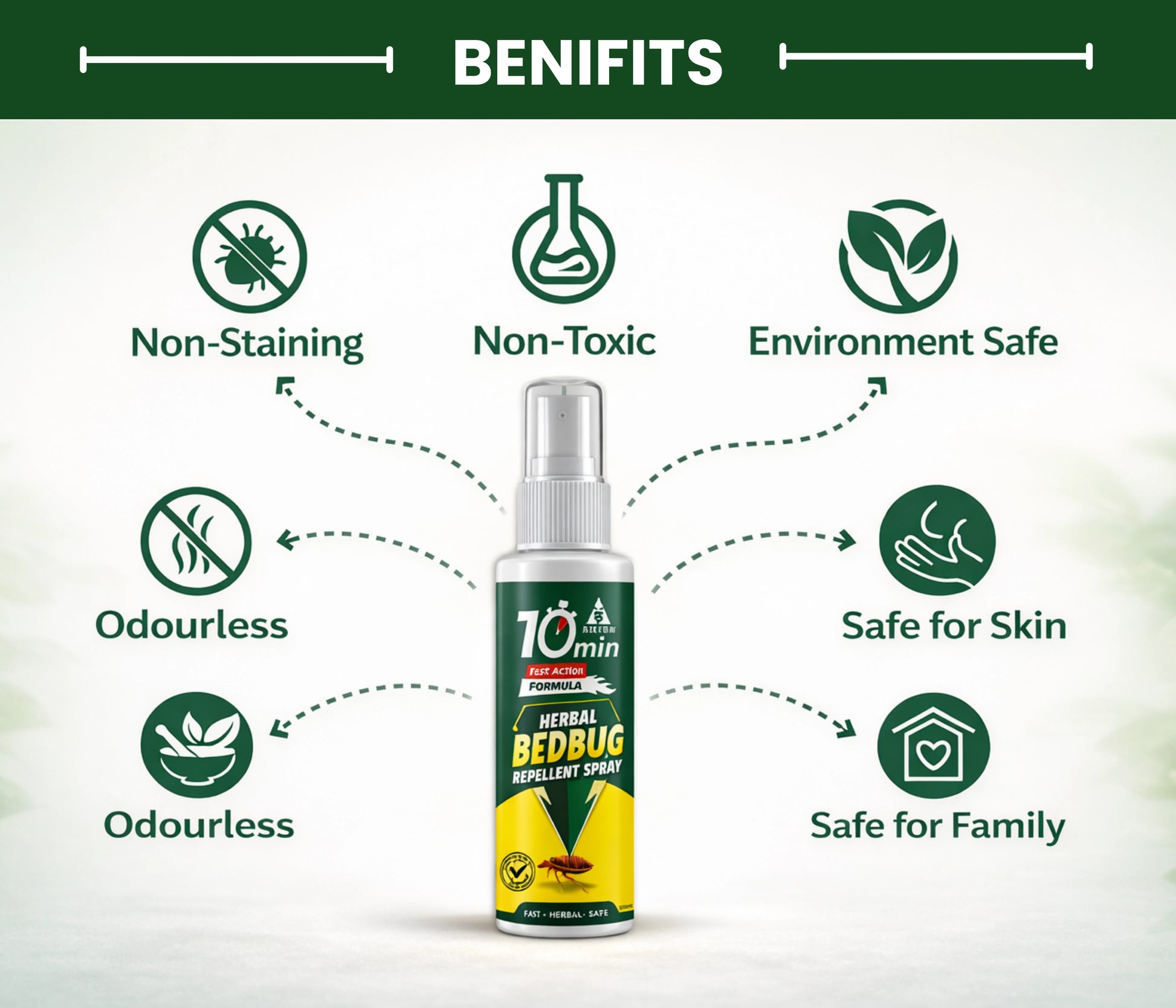 Powerful Bed Bug Spray Fast & Long-Lasting Protection Eliminate bed bugs effectively with this powerful Bed Bug Spray, a strong liquid bed bug repellent specially formulated to target bedbugs (khatmal / ????) at every stage of their life cycle. This instant, powerful bedbug remover penetrates deep into cracks, crevices, mattress seams, and hidden nesting areas to help control home bugs and household pest problems at the source. Designed for indoor home use, this Amish Bed Bug Spray works quickly on adult bed bugs, nymphs, and eggs, offering reliable, long-lasting protection. Its targeted action helps prevent re-infestation, making it an effective bedbug controller, stopper, and protector for bedrooms and living spaces. Formulated as a herbal, organic, eco-friendly solution, this ayurvedic pest repellent is safe when used as directed and suitable for daily household use. The odorless, non-staining formula makes it ideal for fabrics and furniture without leaving residue. The easy-to-use spray bottle (sprayer) ensures precise, mess-free application on beds, mattresses, sofas, furniture, curtains, carpets, bags, and fabric surfaces. This eco fabric repeller keeps your home clean while helping repel unwanted pests naturally. Ideal for homes, bedrooms, hotels, hostels, PG accommodations, and guest houses, this original, safe, and eco bed bug repellent spray offers a super-effective pest control solution for anyone facing bed bug / badbug / khatamal problems in living spaces.