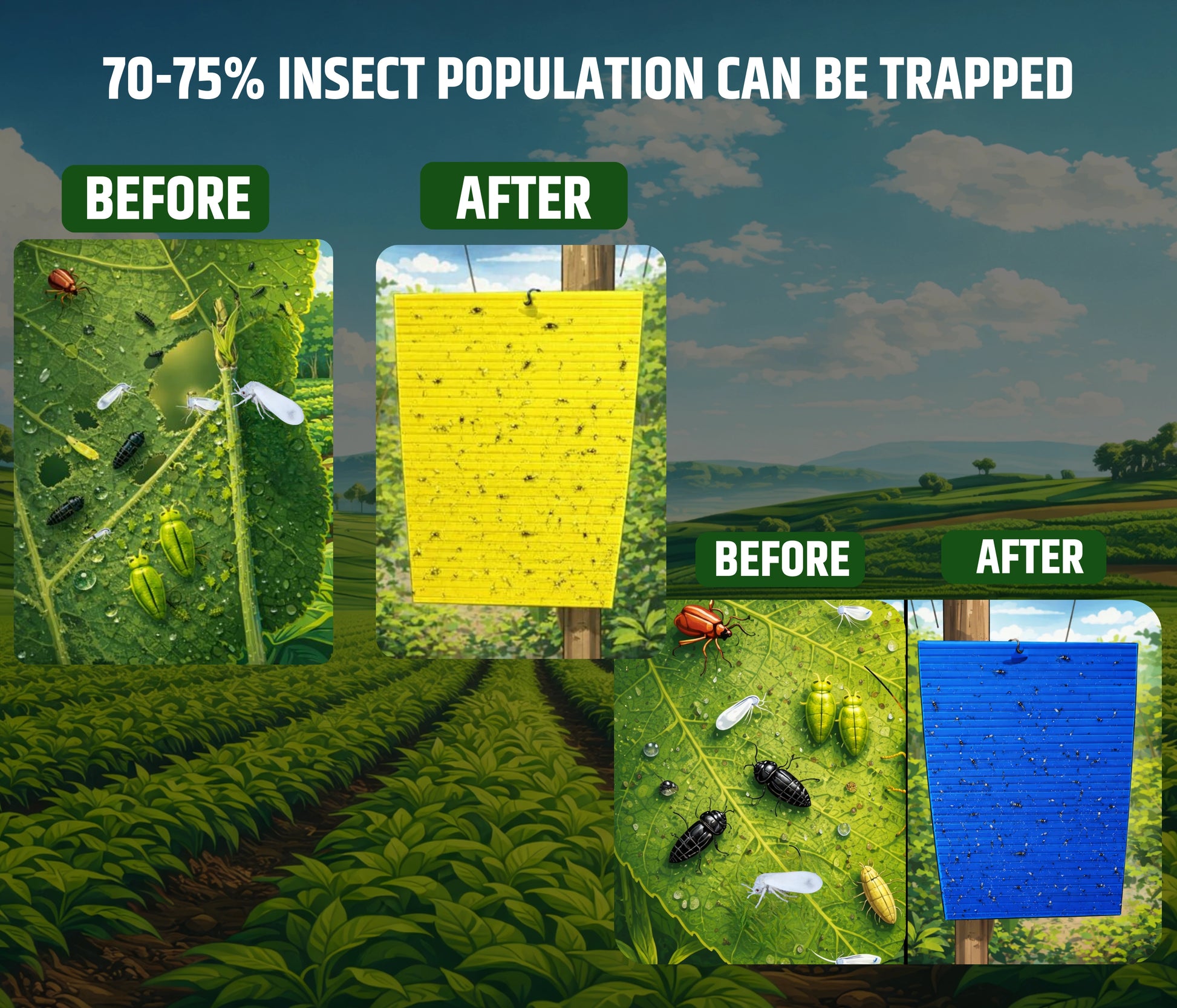 The chipku fly trap has an advanced technology of natural attraction designed to offer superior insect control for which is useful for agriculture field, gardens, farm, terrace garden and farmhouse. Using sticky trap is organic way of farming which completely minimizes the use of chemical insect control methods. It creates zero pollution zone in farm and garden. These traps help maintain a clean, insect-free environment in your farm or garden, promoting healthier and more sustainable farming practices The traps are made with thick cardboard material coated with high class strong gum. The gum is coated on both surface of trap which provide more area to capture more insects. The insects have characteristic of getting attracted towards color and scent for feeding and reproducing purpose. Chipku yellow+ Blue sticky trap is made with Natural attraction technique. Yellow+ Blue color of sticky trap works as natural attractant and attracts number of saps feeding insects. Once this insect comes in contact with the gum layer of sticky trap, they get stuck with it. The strength of gum does not allow insects to fly again and they have to complete remaining life on the trap. The tiny sap feeding insects gets multiplied in hundreds within few days which can damage the yield up to 70-80%. Once the insects get trapped with sticky trap the chain of their lifecycle breaks and prevents the future loss. The sticky traps should be installed after 1 to 2 weeks of plantation in order to avoid early insect attack. Before mass trapping note the quantity of insects getting stuck each day. If you observe that the sheet is getting filled 20% the start mass trapping. Use 30 sheets of sticky trap for 1 acre. By incorporating Chipku Yellow+ Blue Sticky Traps into your insect management strategy, you can effectively control harmful insects while following to organic farming principles, ultimately protection your crop yield and quality.