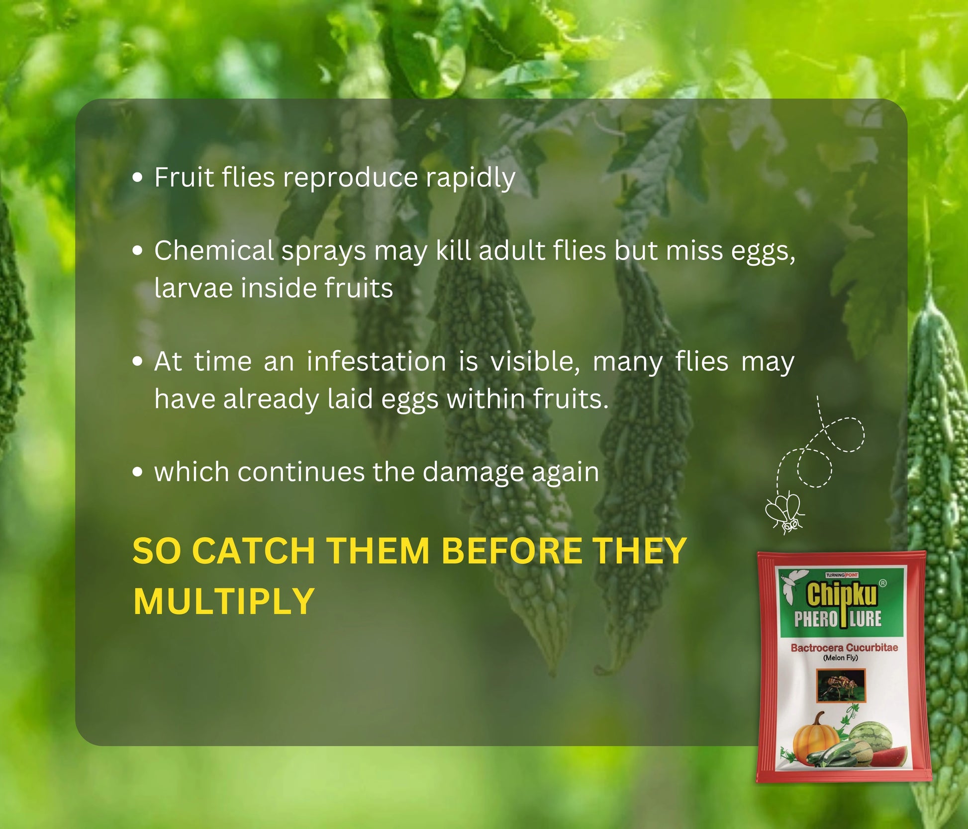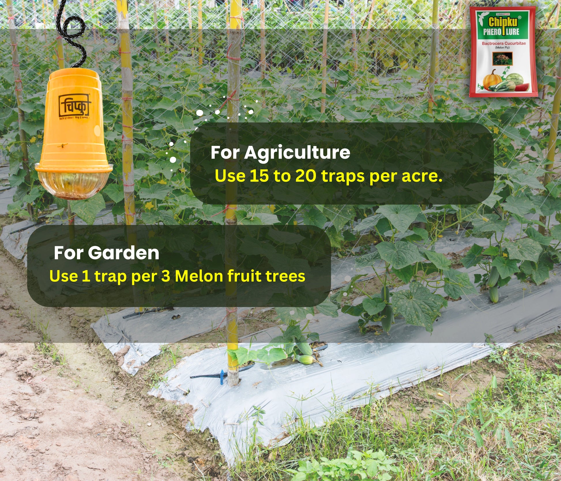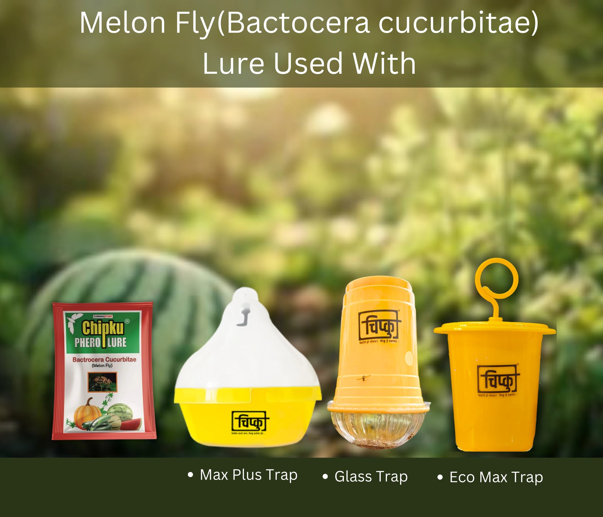 The CHIPKU Melon Fly Lure & chipku Traps for melon fruit fly is the ultimate solution for effective melon fly control. Melonfly lure is Designed specifically for organic farming, this lure & traps agriculture helps growers keep their fruits—like pumpkin, melon, botle gourd, bitter gourd more healthy & toxin-free. The Pheromone scent-based lures are used with traps to attract harmful insects without chemical spray & harming friendly insects essential for pollination. It is weather-proof, cost-effective, long-lasting, making it a dependable tool to safeguard melon crops. Each makkhi trap with Melonfly lure can capture up to 70-75% of the insect population, with potential to control up to 99% of melon fruit flies when used correctly and replaced regularly. This specifically tailored to target species such as Bactrocera cucurbit among others. By minimizing pesticide usage, it supports sustainable agriculture, protecting the environment and improving the quality of melon crops. With easy installation, feromone lure is ideal for farms of all sizes plant traps for balcony. Simply open lure packet, tie it securely inside trap, and hang it on your fruit trees. Reusable & durable, the melon fruit fly trap withstands climate changes and functions effectively across all seasons. chipku pheromone trap & chipku phero lure provides valuable monitoring insights, helping you observe insect infestations early, so you can take prompt action to protect your crops. Ensure that you replace the lure every 60 days for optimal performance. This solution is not only economical but also melon fruit protector aligns with organic practices, ensuring fruit quality & maintaining farm eco-balance. Use makshikari trap with melon fly lure for diverse crops, including melon, pumpkin, bitter gourd, bottle gourd. Eliminate destructive melon fruit flies & say goodbye to harmful chemicals while preserving the health of your crops and the ecosystem.