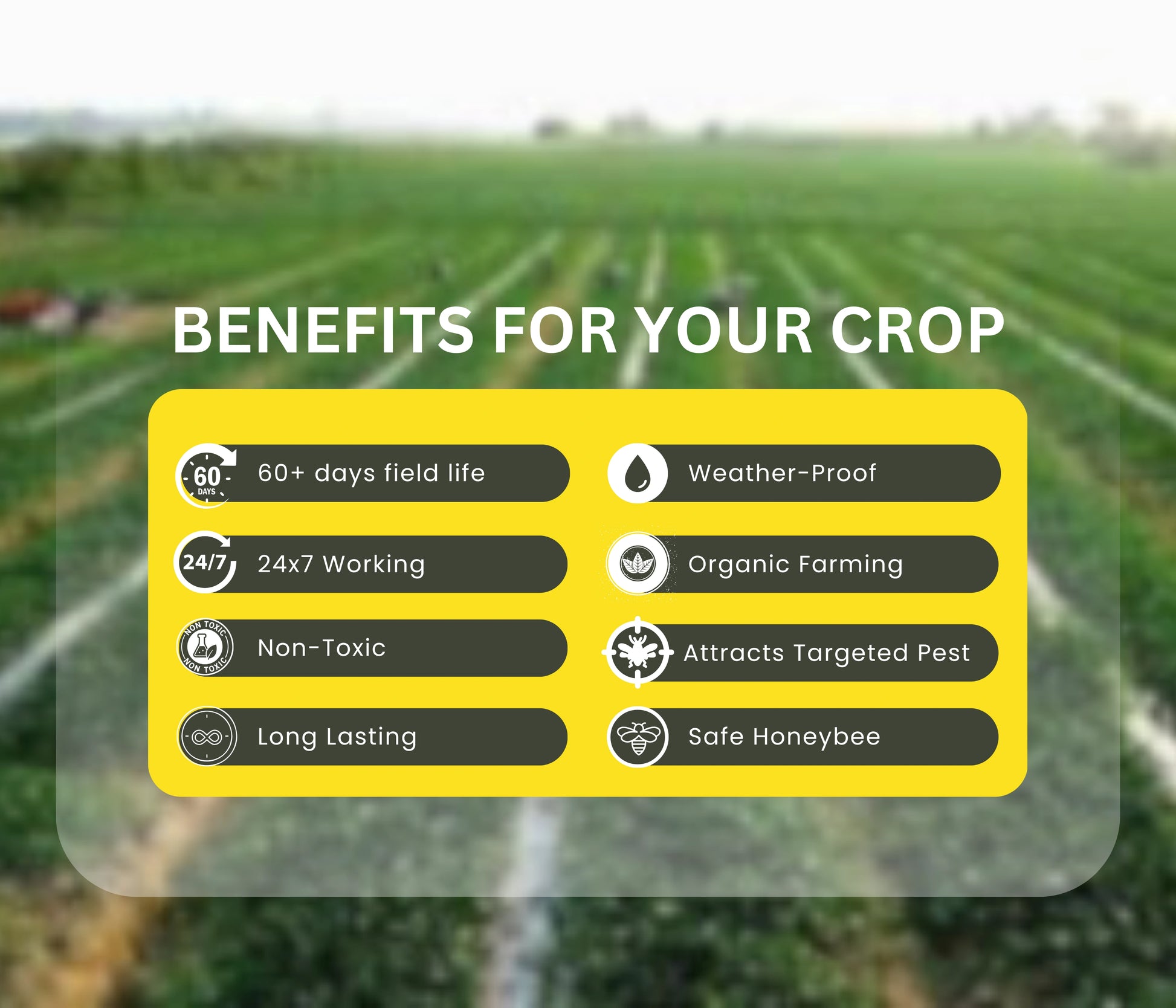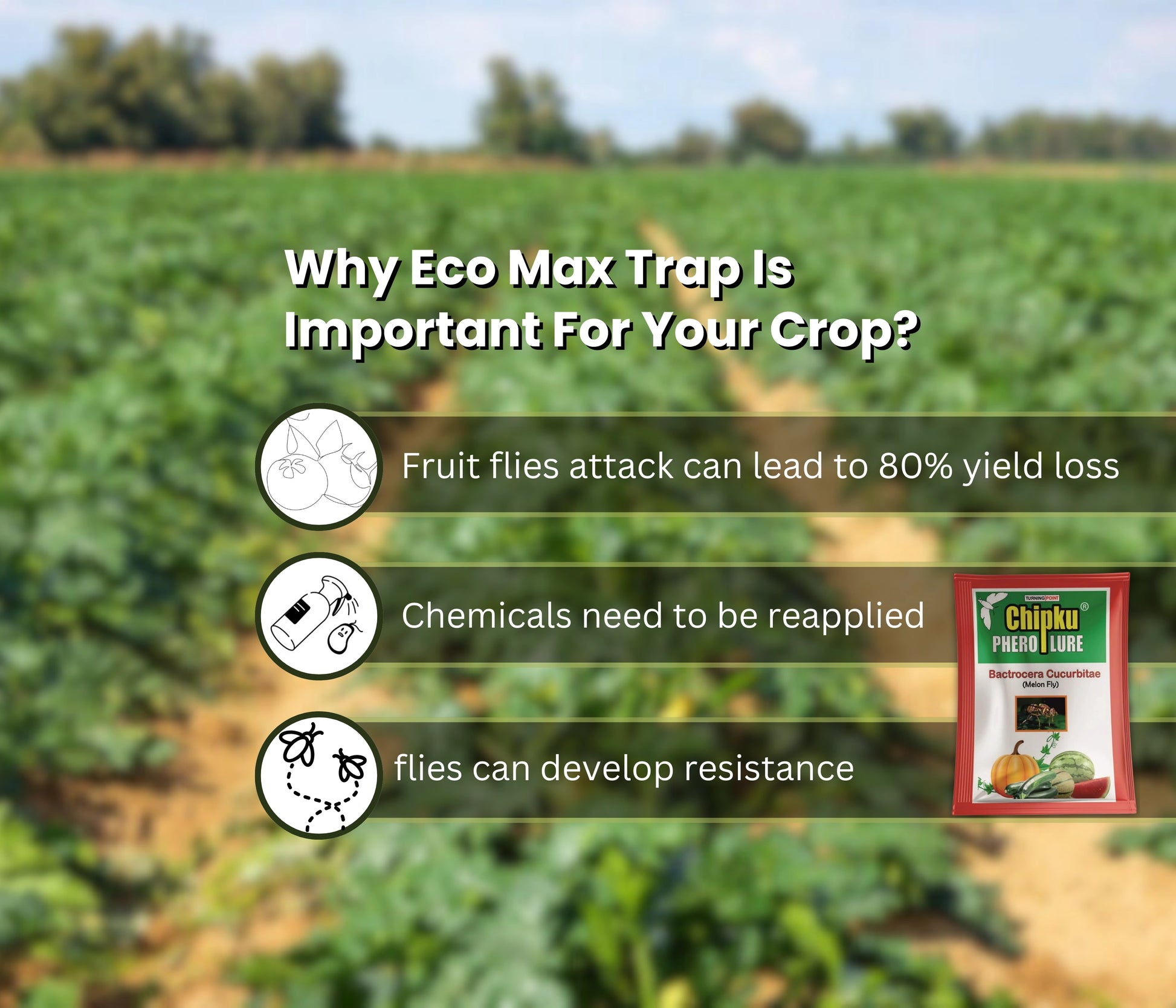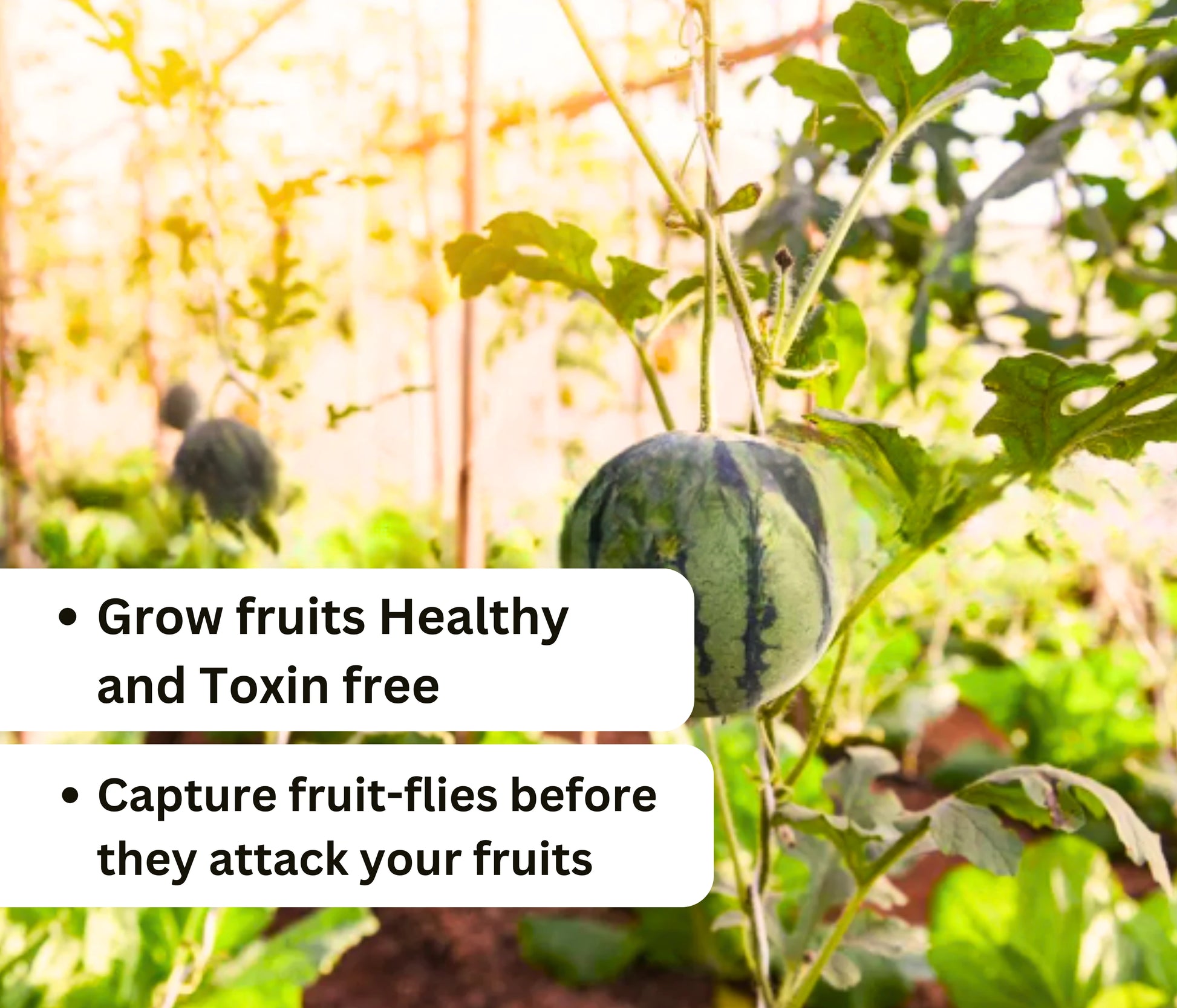 The CHIPKU Melon Fly Lure & chipku Traps for melon fruit fly is the ultimate solution for effective melon fly control. Melonfly lure is Designed specifically for organic farming, this lure & traps agriculture helps growers keep their fruits—like pumpkin, melon, botle gourd, bitter gourd more healthy & toxin-free. The Pheromone scent-based lures are used with traps to attract harmful insects without chemical spray & harming friendly insects essential for pollination. It is weather-proof, cost-effective, long-lasting, making it a dependable tool to safeguard melon crops. Each makkhi trap with Melonfly lure can capture up to 70-75% of the insect population, with potential to control up to 99% of melon fruit flies when used correctly and replaced regularly. This specifically tailored to target species such as Bactrocera cucurbit among others. By minimizing pesticide usage, it supports sustainable agriculture, protecting the environment and improving the quality of melon crops. With easy installation, feromone lure is ideal for farms of all sizes plant traps for balcony. Simply open lure packet, tie it securely inside trap, and hang it on your fruit trees. Reusable & durable, the melon fruit fly trap withstands climate changes and functions effectively across all seasons. chipku pheromone trap & chipku phero lure provides valuable monitoring insights, helping you observe insect infestations early, so you can take prompt action to protect your crops. Ensure that you replace the lure every 60 days for optimal performance. This solution is not only economical but also melon fruit protector aligns with organic practices, ensuring fruit quality & maintaining farm eco-balance. Use makshikari trap with melon fly lure for diverse crops, including melon, pumpkin, bitter gourd, bottle gourd. Eliminate destructive melon fruit flies & say goodbye to harmful chemicals while preserving the health of your crops and the ecosystem.