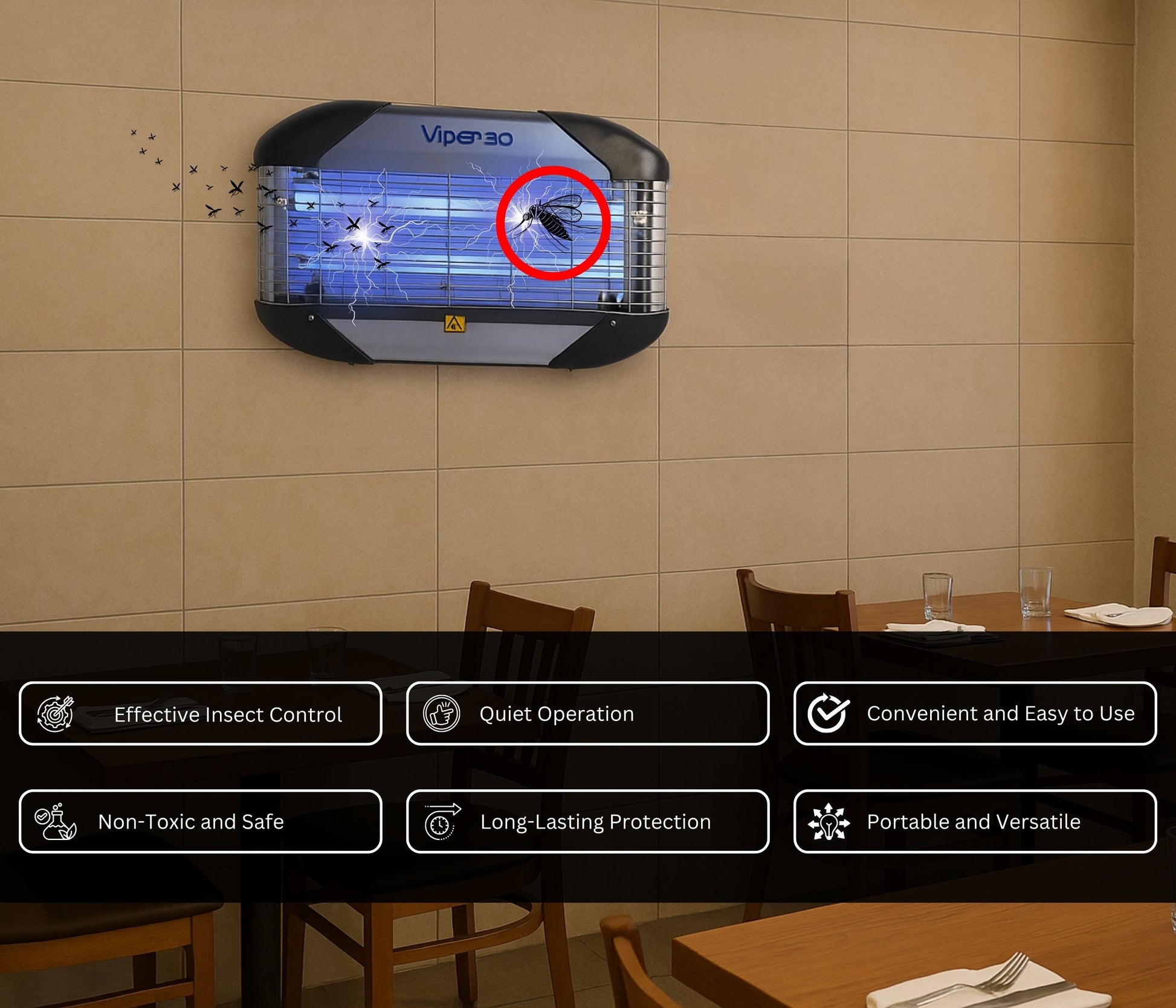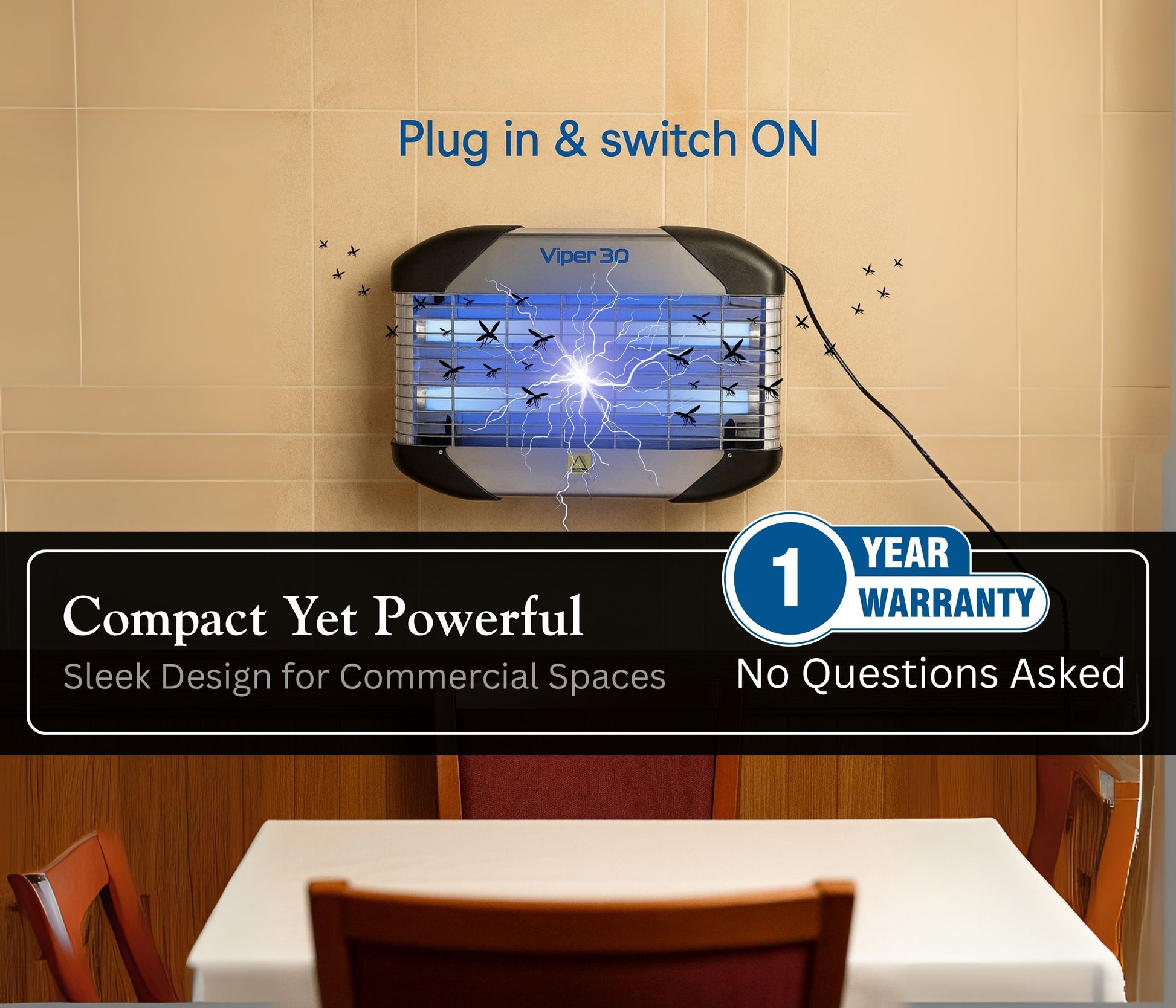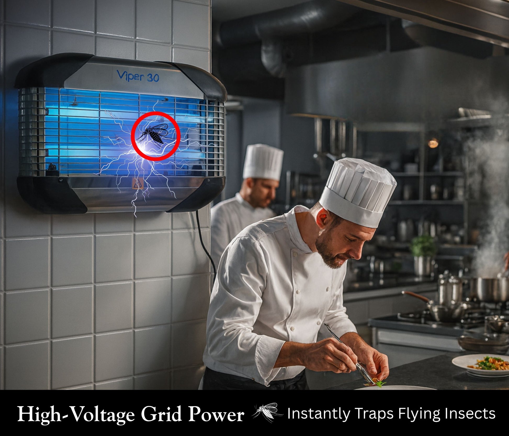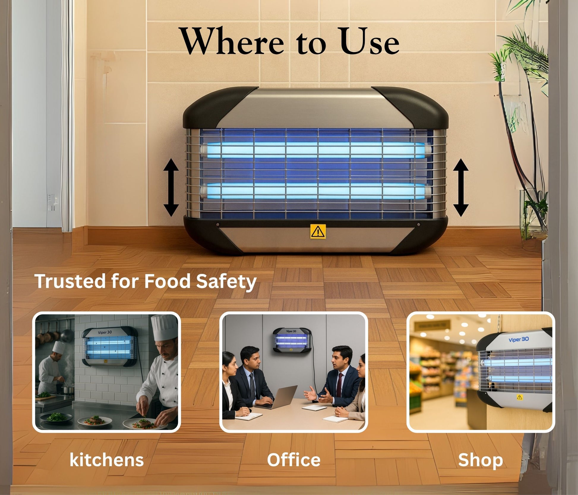Ideal for environments that require strict hygiene standards, such as kitchens, bakeries, supermarkets, and warehouses, the Viper 30 is the perfect choice to keep your space fly-free and safe. The unit operates silently, ensuring a discreet solution without disrupting the work environment.