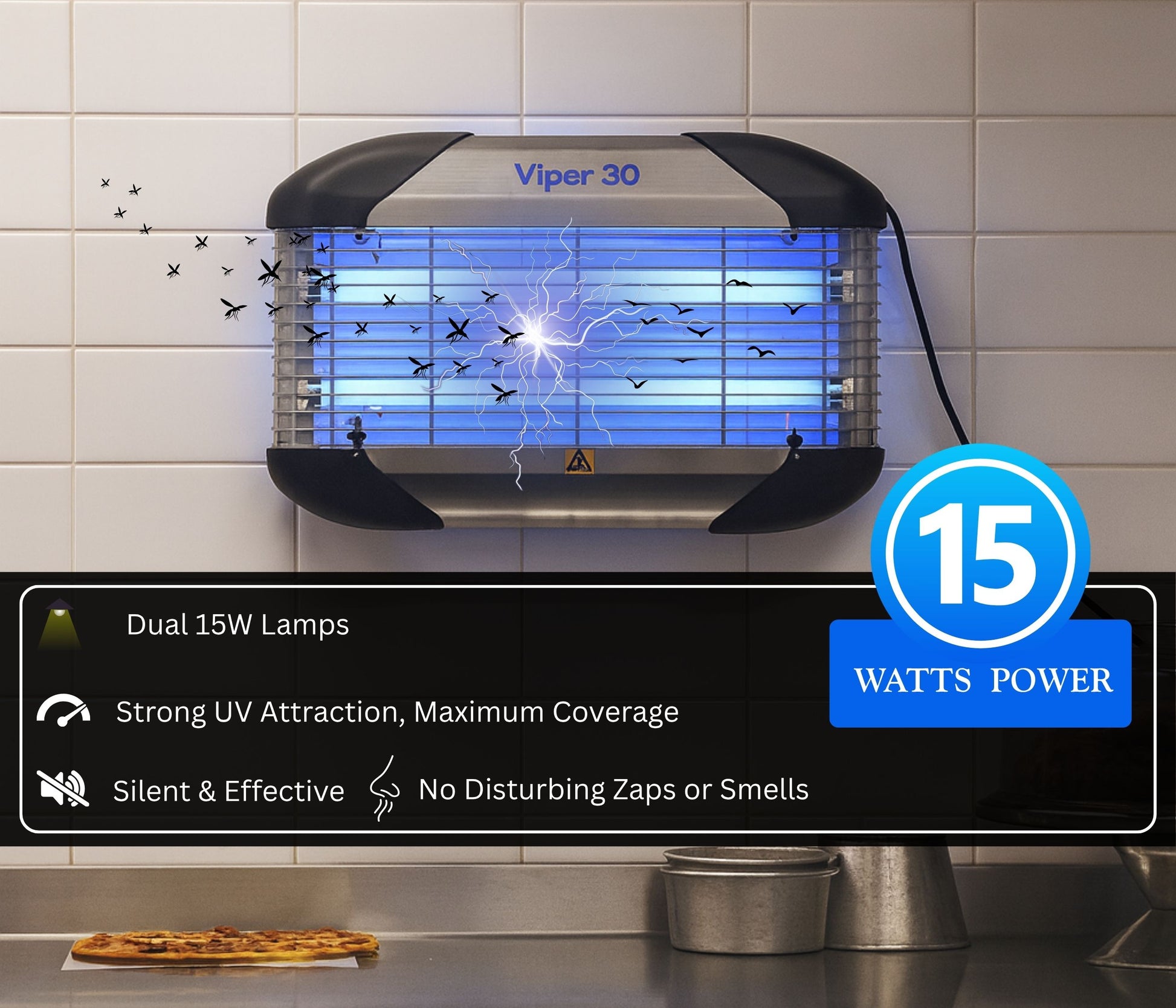 The Viper 30 Fly Trap is a compact, efficient, and reliable insect control solution designed specifically for commercial use. Equipped with dual 15W UV lamps, this high-performance fly trap attracts flying insects and traps them either in a high-voltage grid or on a hygienic glue board (optional), ensuring maximum efficiency and HACCP compliance.