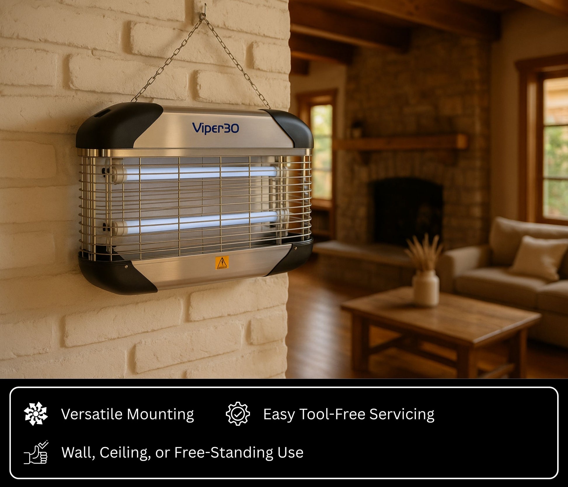 Designed for easy mounting in a variety of positions (wall-mounted, ceiling-mounted, or free-standing), the Viper 30 Fly Trap offers flexible installation options to suit any commercial space. Quick servicing and maintenance make it a cost-effective and low-maintenance choice for busy environments.